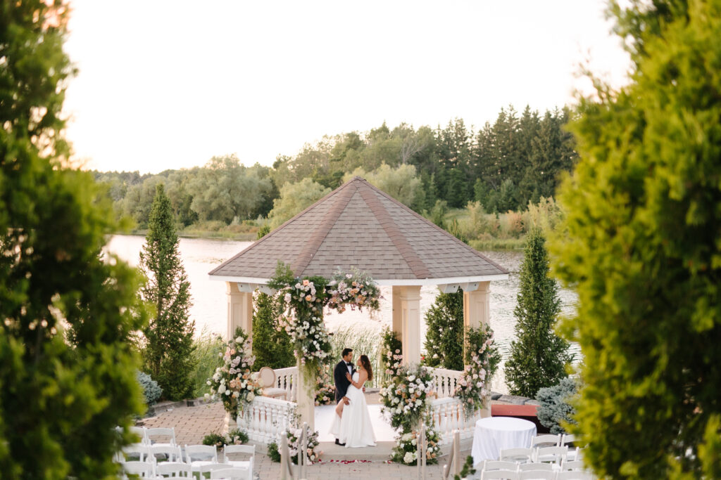Set on 55 acres on Innis Lake, The Royal Ambassador Event Centre in Caledon is hosts outdoor weddings in a gazebo overlooking a lake. The Lakeside Gazebo on Innis Lake features a tiered seating system for up to 200 guests on the lawn with views overlooking the water. The Terrace Gazebo is just a stone’s throw from the lake with lawn seating for up to 250 guests.